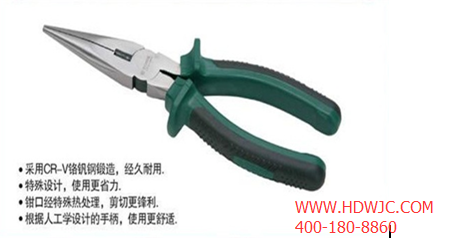 修口鉗、尖頭鉗、尖咀鉗等等,這都是尖嘴鉗的別稱。它是由尖頭、刀口和鉗柄組成,電工用尖嘴鉗的 材質一般由45#鋼制作,類別為中碳鋼。含碳量0.45%,韌性硬度都合適。鉗柄上套有額定電壓500V的絕緣套管。尖嘴鉗的操作方法很忙簡單,一般用右手操作,使用時握住尖嘴鉗的兩個手柄,開始夾持或剪切工作。它的維護很簡單,不用尖嘴鉗時,應表面涂上潤滑防銹油,以免生銹,或者支點發(fā)澀。
