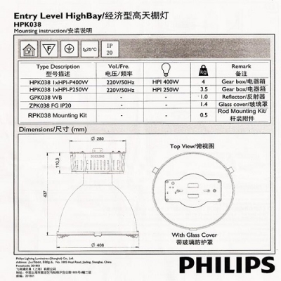 飛利浦?天棚吊燈?HPK038?250W?400W?HPI?BUS金鹵燈?工廠車(chē)間倉(cāng)庫(kù)姜堰區(qū)王虎建材批發(fā)部