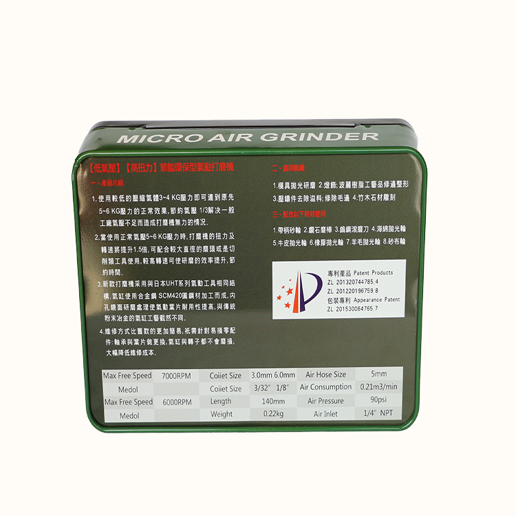 臺灣氣動刻磨機特點:體積小重量輕,鋁筆形,指尖能購充分握住精密設計的葉片研磨器,安全耐久高速旋轉(zhuǎn),