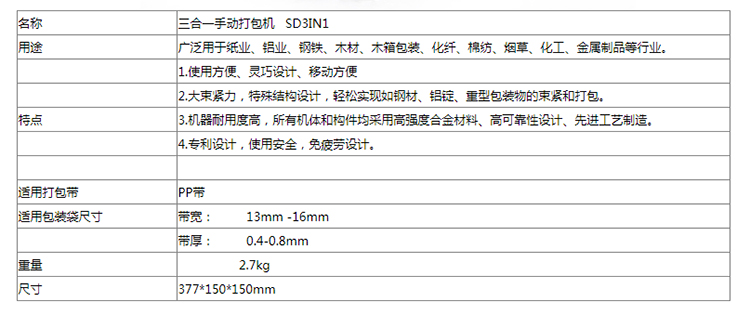 SD3IN1三合一手動打包機:機器耐用度高,所有機體和構(gòu)件均采用高強度合金材料、高可靠性設計、先進工藝制造。專利設計,使用安全,免疲勞設計。