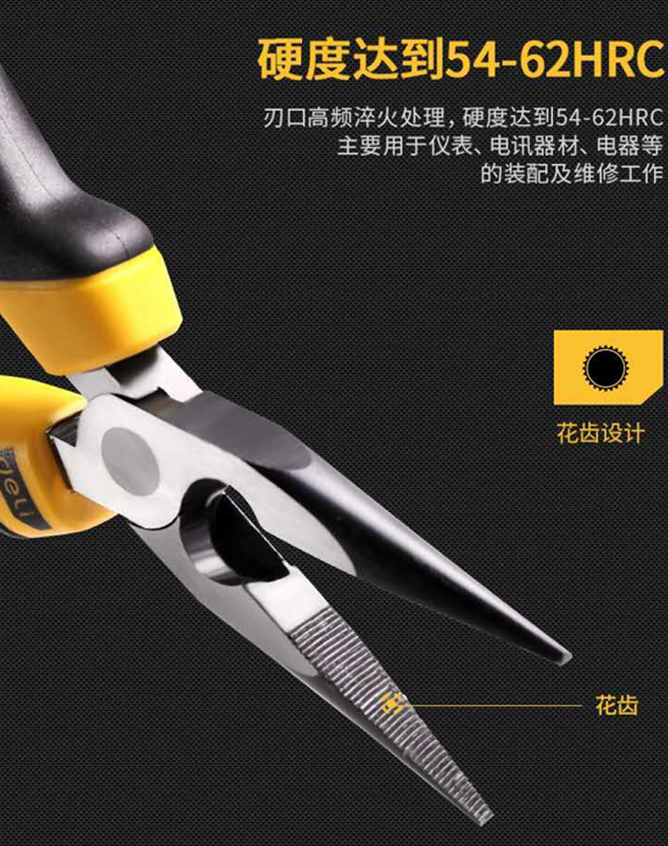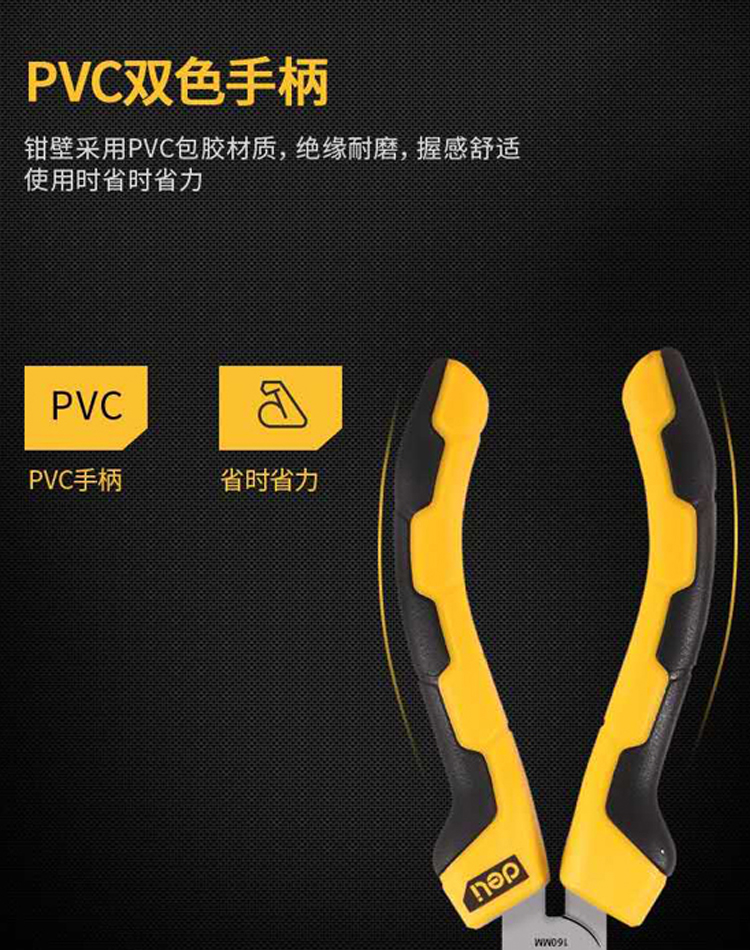 尖嘴鉗鉗壁采用PVC包膠材質(zhì),絕緣耐磨,握感舒適,使用時省時省力
