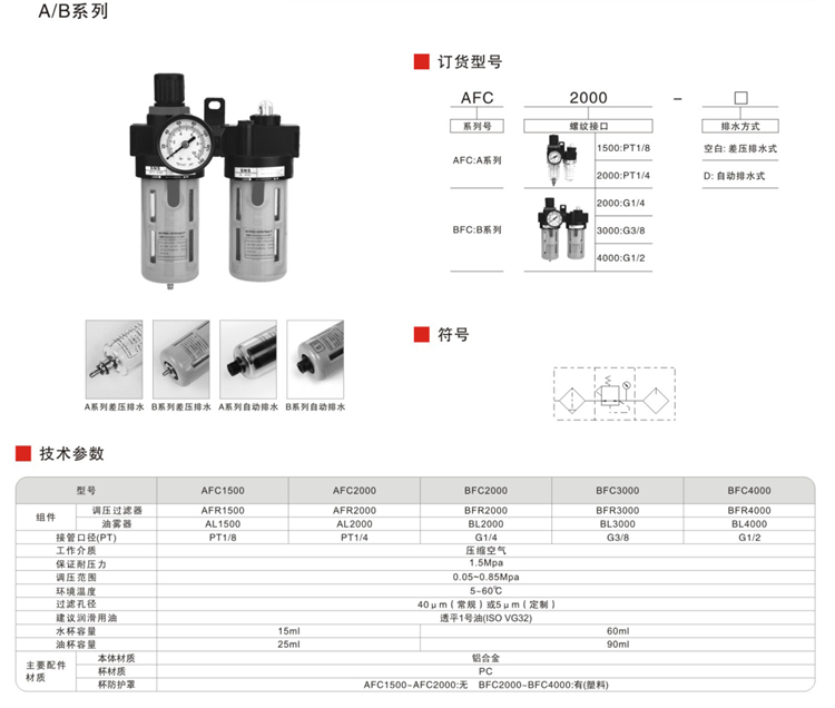 神馳氣動AC系列調(diào)壓過濾組合二聯(lián)件主要參數(shù)