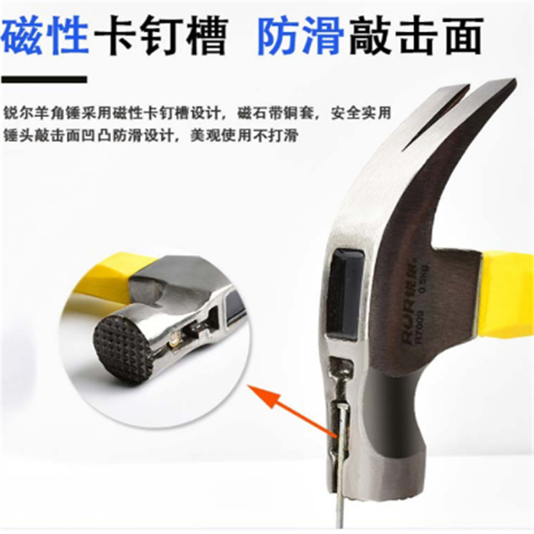 銳爾雙色柄羊角錘采用磁性卡釘槽設(shè)計(jì),磁石帶銅套,安全實(shí)用,錘頭敲擊面凹凸防滑設(shè)計(jì),美觀大方不打滑。