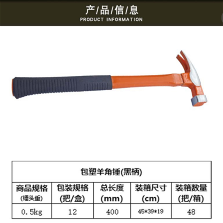 浩祥包塑柄羊角錘黑柄優(yōu)質(zhì)高碳鋼鍛造,高溫淬火,韌性強(qiáng)硬度高,一體成型更安全。