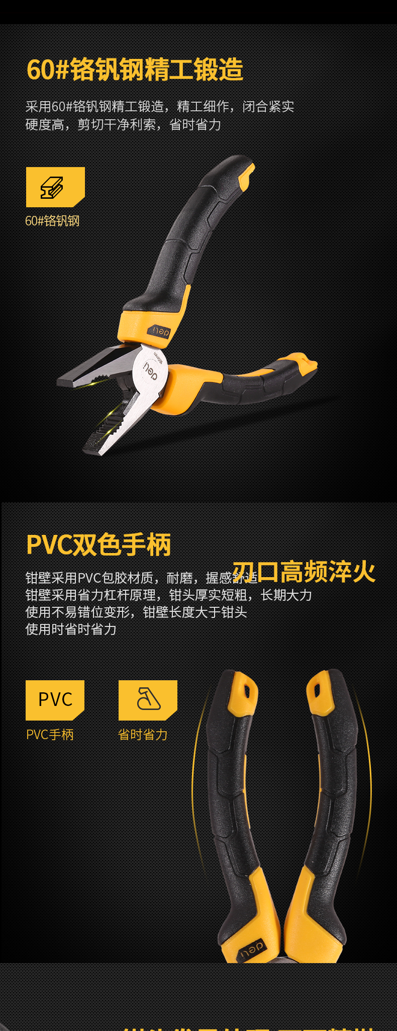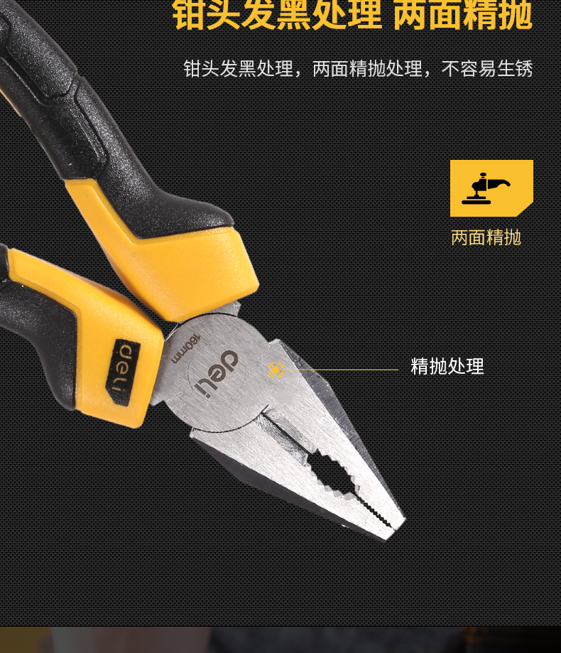 得力老虎鉗子鋼絲鉗采用60#鉻釩鋼精工鍛造,精工細(xì)作,閉合緊實(shí)硬度高,剪切干凈利索,省時(shí)省力。
