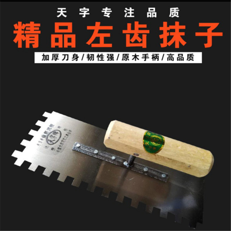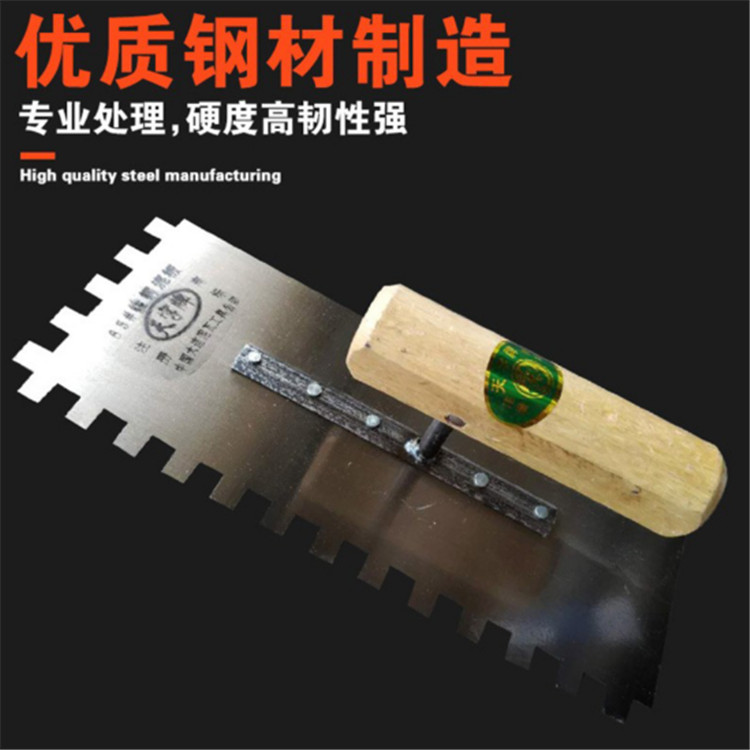 鑫誠左齒抹子優(yōu)質(zhì)鋼材制造,專業(yè)處理,硬度高、加厚刀身、韌性強、原木手柄、高品質(zhì),精品小尖齒抹子。
