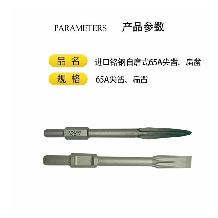 鉻鋼自磨式65A鑿子采用高溫熱處理工藝,大大的提高了產品的韌性和硬度。