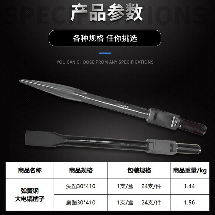彈簧鋼大電鎬鑿子采用優(yōu)質(zhì)彈簧鋼制作,質(zhì)地堅硬耐磨,韌性強,高溫不卷刃。