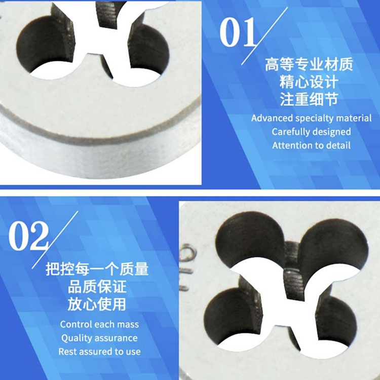 圓板牙采用全磨制工藝,表面光滑,標(biāo)準(zhǔn)牙鋸,螺紋清晰整齊,無毛刺,受力均勻,不易打滑。