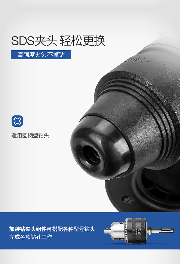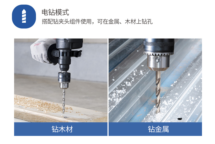 加裝鉆夾頭組件可搭配各種型號鉆頭完成各鉆孔工作需求。