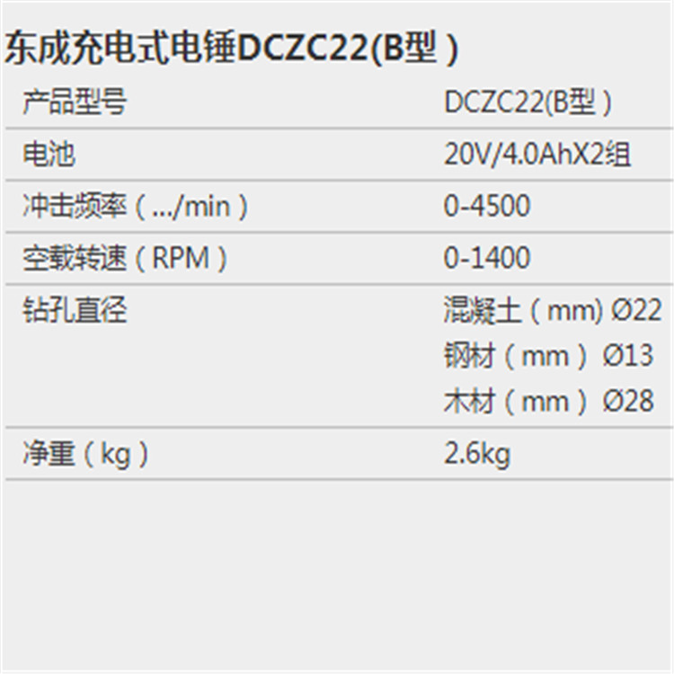 東成充電式電錘DCZC22(B型),產(chǎn)品參數(shù)如圖。