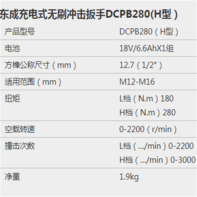 東成充電式無刷沖擊扳手DCPB280(H型),產(chǎn)品參數(shù)圖。