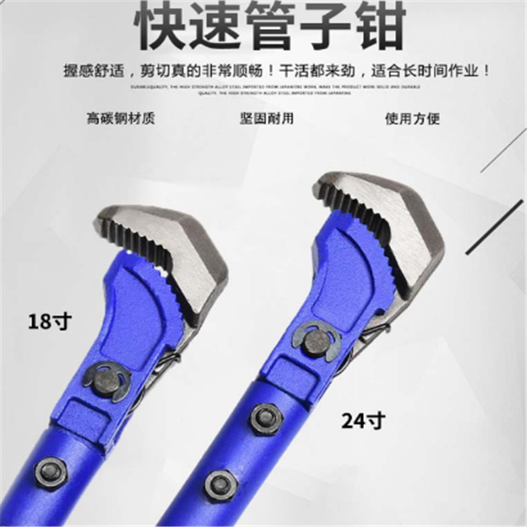 銳爾快速管子鉗優(yōu)質(zhì)高碳鋼,整體熱處理,硬度高韌性好,堅固耐用,使用方便。