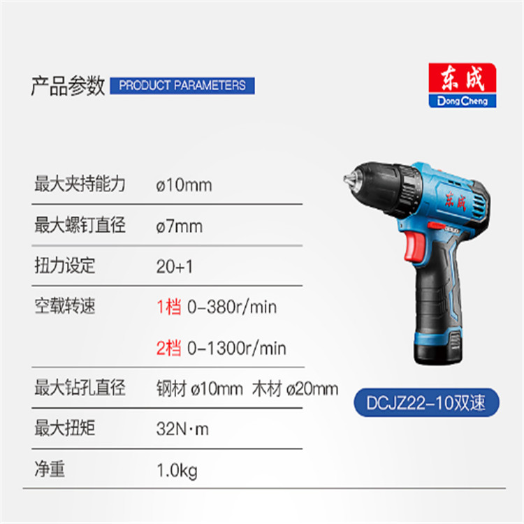 東成充電式起子電鉆DCJZ22-10E隨著夾緊力增大,鉆頭可發(fā)出三聲“咔噠”之聲,分別對應(yīng)了三種大小不同的夾緊力,