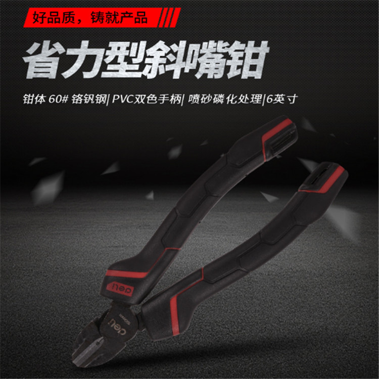 得力6寸省力型斜嘴鉗采用60#鉻釩鋼精工鍛造,噴砂磷化處理,防銹效果好;偏心結(jié)構(gòu)設(shè)計,省力30%,剪切更輕松;刃口高頻淬火。
