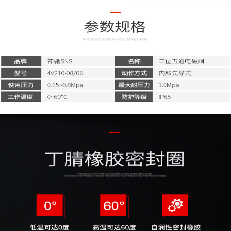 SNS神馳電磁閥采用丁腈自潤橡膠密封圈,密封性好,低溫可達0度高溫可達60度。