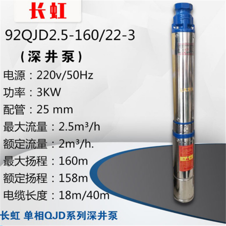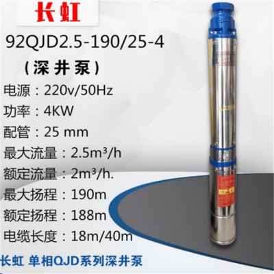 長(zhǎng)虹 單相QJD系列深井泵力強(qiáng)勁、高效率、高強(qiáng)度、高揚(yáng)程、壽命長(zhǎng)、安裝便捷。