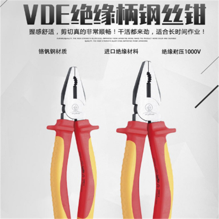 宏遠VDE絕緣柄鋼絲鉗采用鉻釩鋼材質(zhì),進口絕緣耐壓材料,剪切順暢,干活得勁,