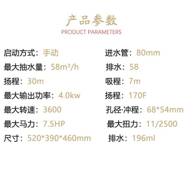 井用取水、農(nóng)田遠(yuǎn)距離輸水、園林大面積,噴灌、消防用水、挖藕、養(yǎng)殖業(yè)等。