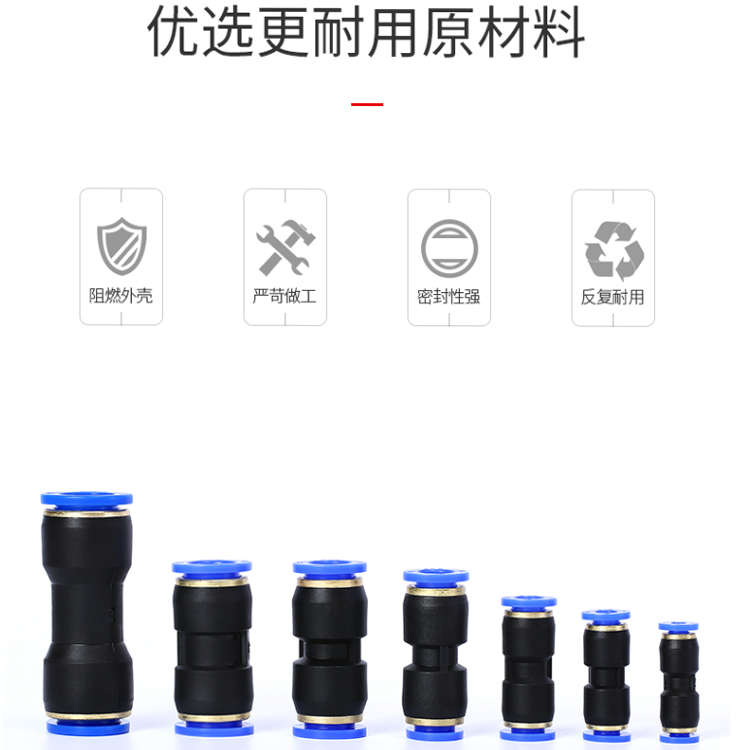 SNS神馳氣動氣管直通快速接頭選用優(yōu)質耐用材料,阻燃外殼設計,安全可靠。