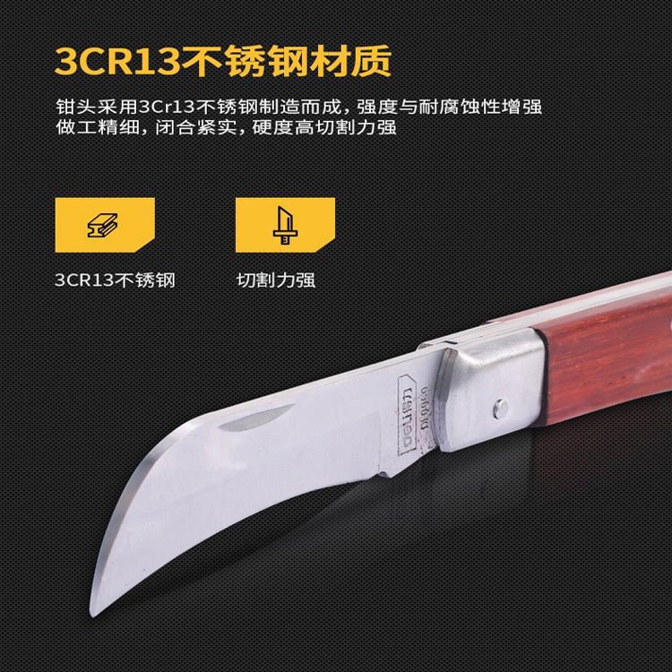 電工刀鉗頭采用3Cr13不銹鋼制造,做工精細,閉合緊實
