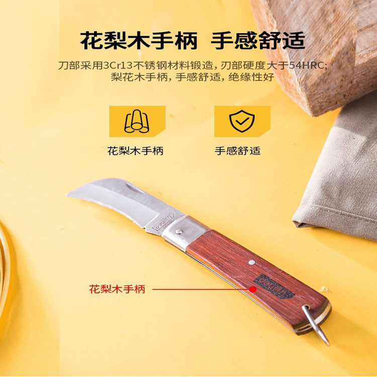 電工刀采用花梨木手柄,手感舒適,絕緣性好