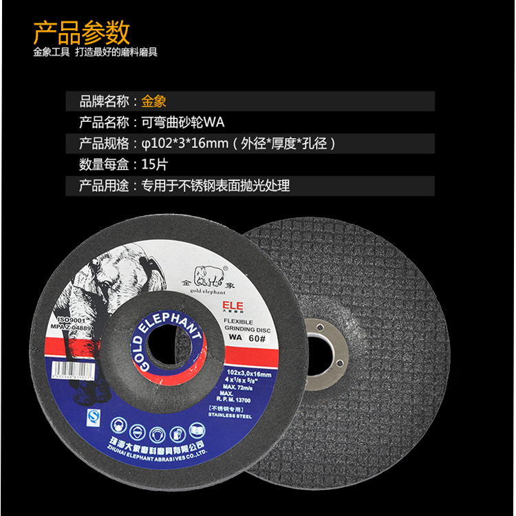 大象金象彈性可彎曲切割片結(jié)構(gòu)安全,性能更高。- 型號(hào)名稱不銹鋼60目15片