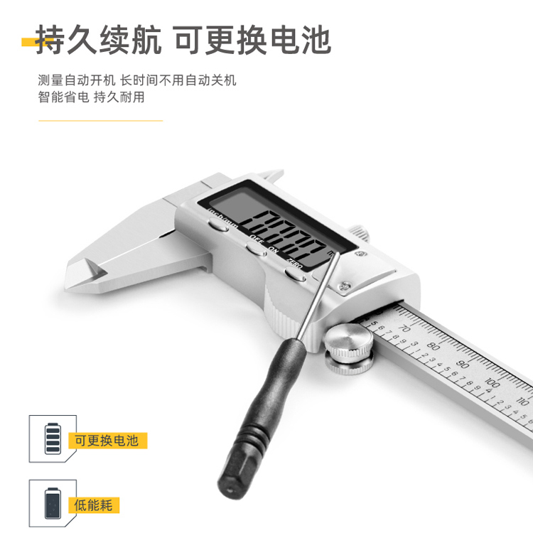 游標(biāo)卡尺測(cè)量自動(dòng)開機(jī),長(zhǎng)時(shí)間不用自動(dòng)關(guān)機(jī),智能省電,持久耐用
