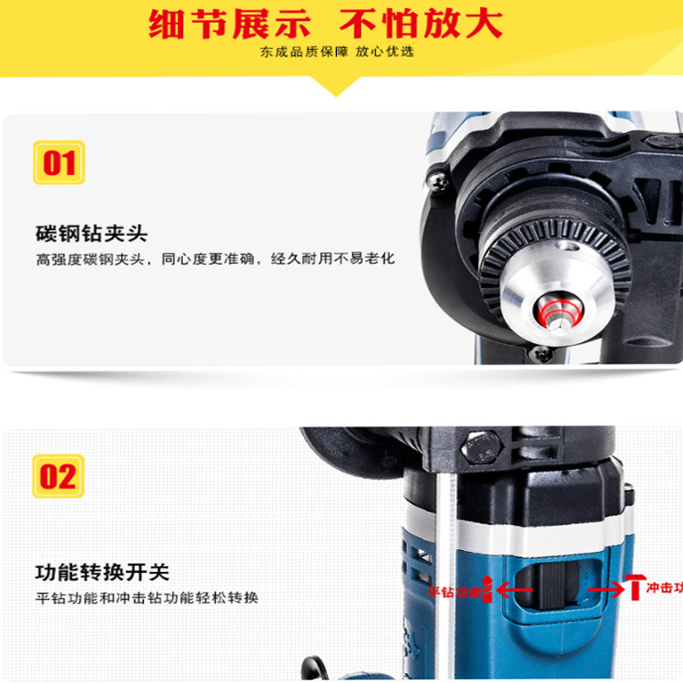 東成沖擊電鉆Z1J-FF-16加裝鉆夾頭組件可搭配各種型號(hào)鉆頭完成各項(xiàng)鉆孔工作