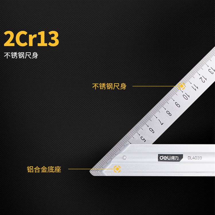 三角尺尺身采用2Cr13不銹鋼制造,高硬度、防銹;底座使用鋁合金鍛造,堅固耐用。