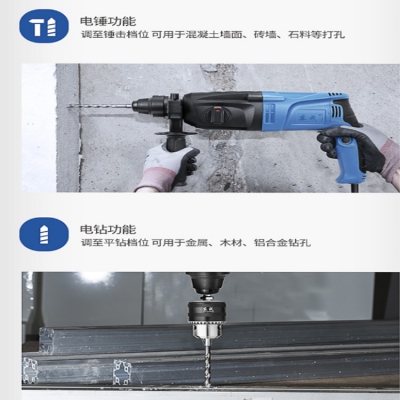 打孔,還有多功能電錘,調(diào)節(jié)到適當(dāng)位置配上適當(dāng)鉆頭可以代替普通電鉆電鎬使用。