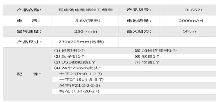 得力鋰電池電動(dòng)螺絲刀組套基本參數(shù)圖