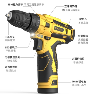 得力(deli) 10.8V無(wú)線雙鋰電電鉆無(wú)級(jí)變速,隨心把握速度。
