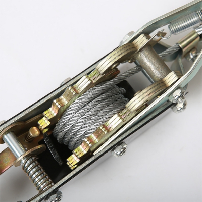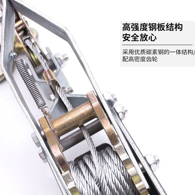 通過反復(fù)扳手帶輪結(jié)構(gòu)轉(zhuǎn)動(dòng),使鋼絲繩在轉(zhuǎn)軸上繞轉(zhuǎn)收縮達(dá)到牽引拉緊作用。
