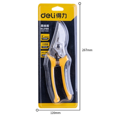 得力彎嘴果枝剪樹枝剪產(chǎn)品刃口采用SUS420不銹鋼精工鍛壓,經(jīng)淬火處理后硬度達50-55HRC,剪切鋒利 。