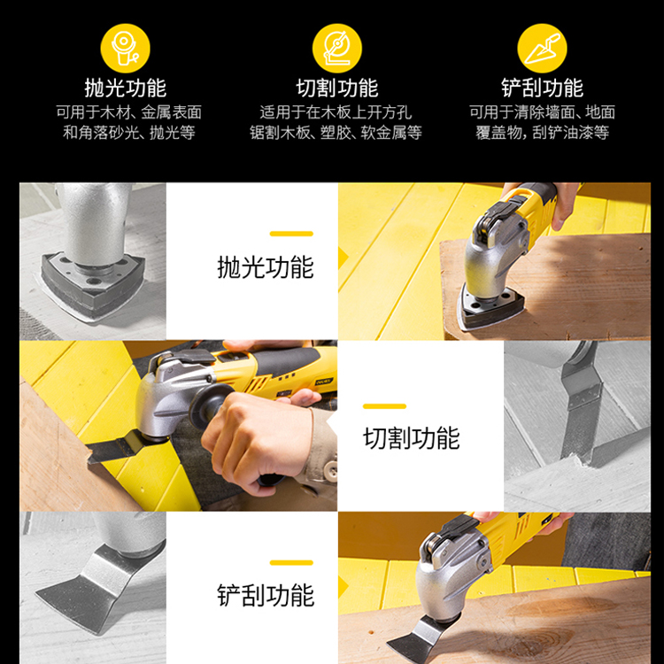得力萬用寶可更換多種工作頭進(jìn)行各種作業(yè)活動(dòng),多種功能隨心操控。