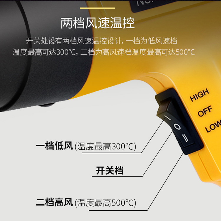 熱風(fēng)槍兩段式調(diào)溫、風(fēng)量切換、防熱設(shè)計、應(yīng)用廣泛