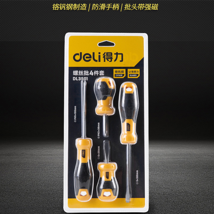得力工具螺絲批4件套刀桿鉻釩鋼材質(zhì)刀頭帶磁性螺絲批套裝DL3501