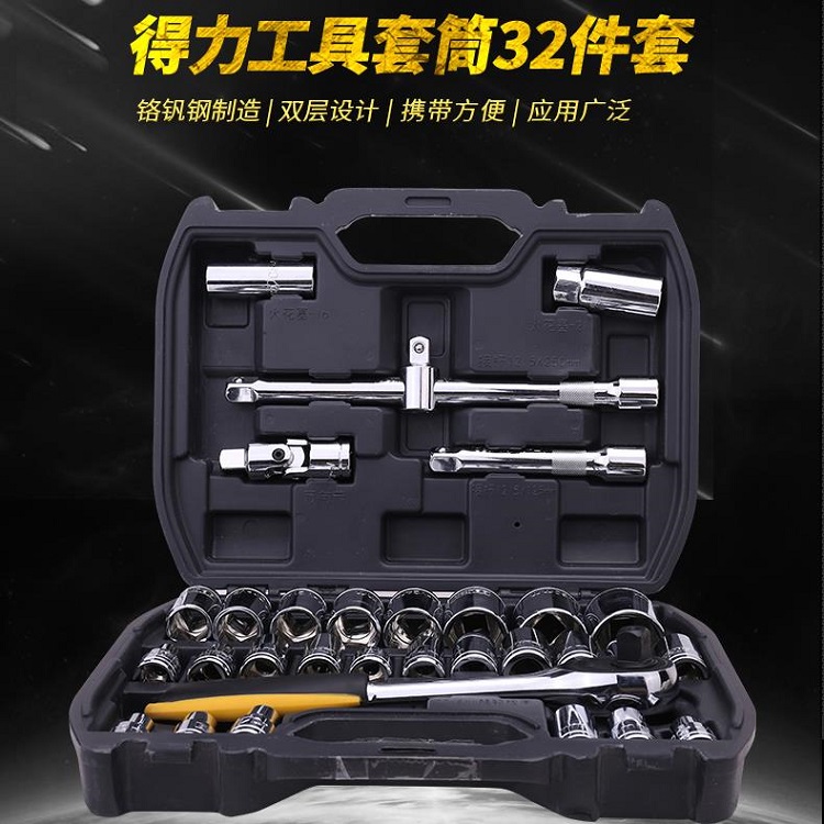 得力工具32件套筒組套汽車(chē)維修機(jī)修工具加長(zhǎng)組套五金工具箱
