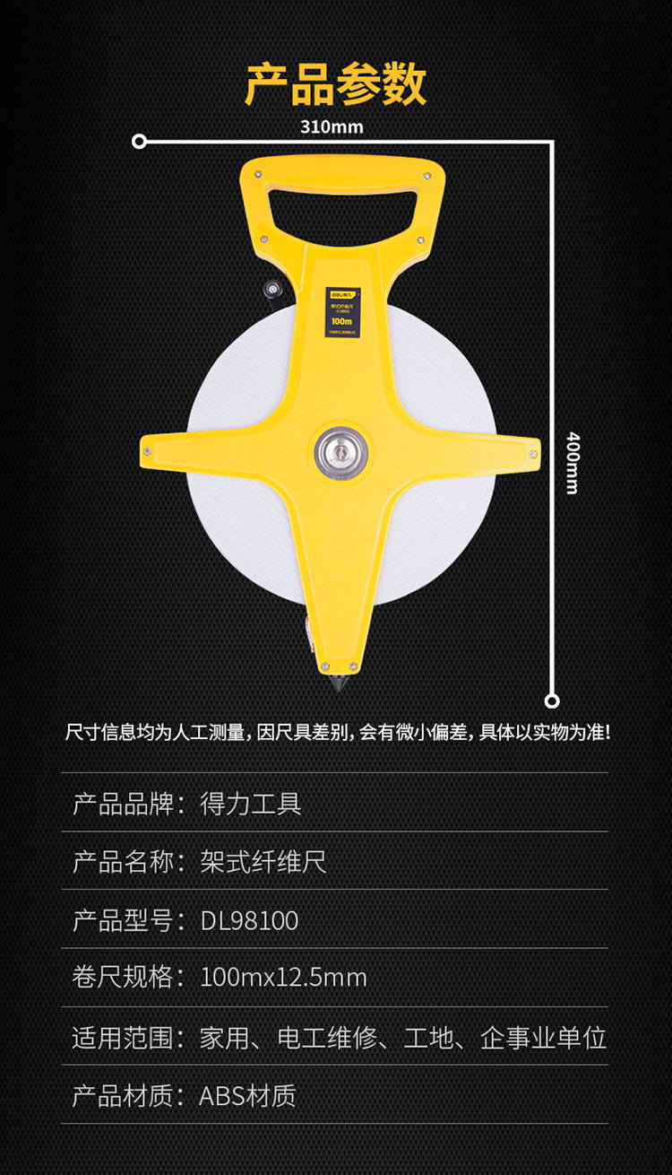 得力工具工程軟尺架式纖維長(zhǎng)尺長(zhǎng)卷尺100米測(cè)量皮卷尺手提尺 米尺
