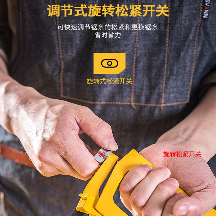 旋轉(zhuǎn)松緊開關(guān),可快遞調(diào)節(jié)鋸條松緊或更換鋸條。