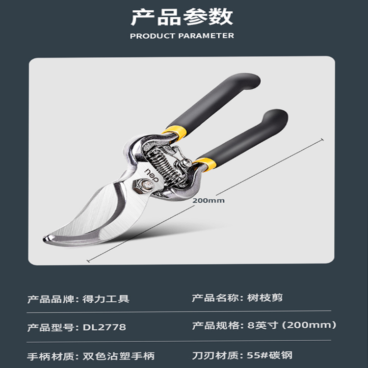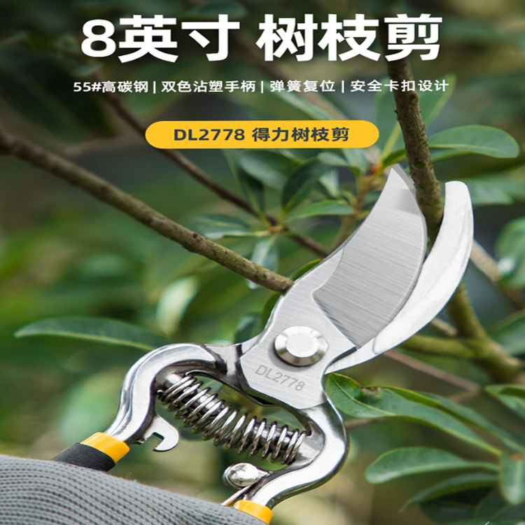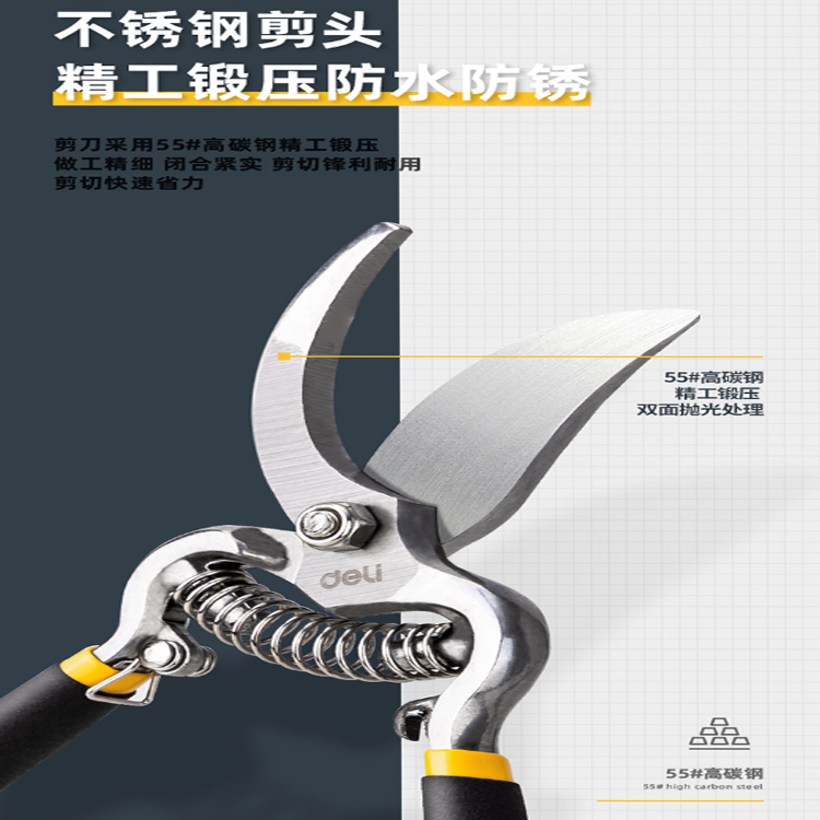 得力(deli) 高碳鋼刀頭樹枝剪表面特氟龍?zhí)幚? 鋒利耐磨剪切快速 采用55#鋼材,硬