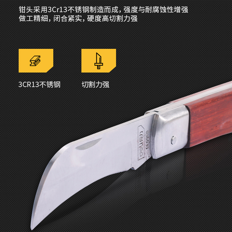 電工刀鉗頭采用3Cr13不銹鋼制造而成,硬度高切割力強(qiáng)