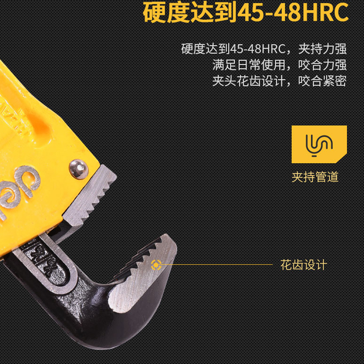 管子鉗硬度達(dá)到45-48HRC,咬合力強(qiáng),夾頭花齒設(shè)計,咬合緊密