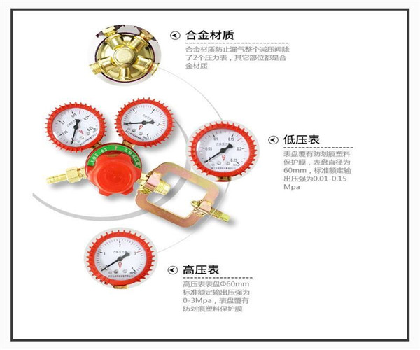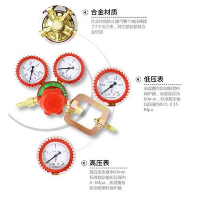 五湖乙炔減壓器(乙炔表)合金材質(zhì)防止漏氣,整個減壓閥除了2個壓力表,其它部位都是合金材質(zhì)