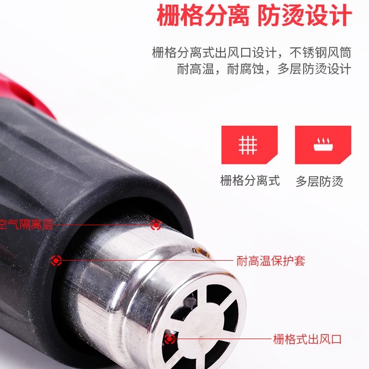 調(diào)溫?zé)犸L(fēng)槍柵格分離式出風(fēng)口設(shè)計(jì),不銹鋼風(fēng)筒耐高溫,耐腐蝕,多層防燙設(shè)計(jì)