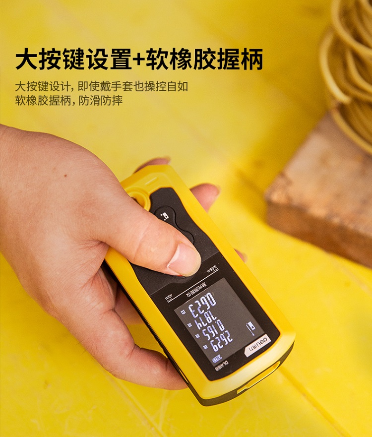 激光尺大按鍵設(shè)計(jì),即使戴手套也操控自如,軟橡膠握柄,防滑防摔