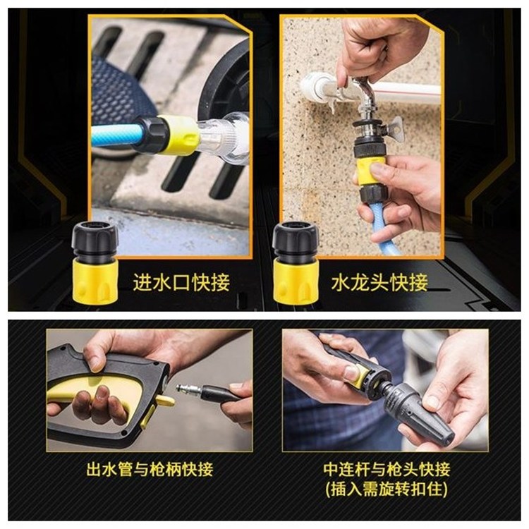 清洗機(jī)快接設(shè)計(jì),一插即可,配2個(gè)快接接頭,可輕松將進(jìn)水管于機(jī)器連接斷開,洗車無需繁瑣連接機(jī)器。