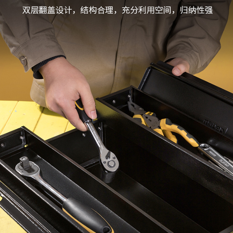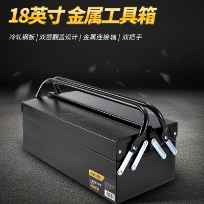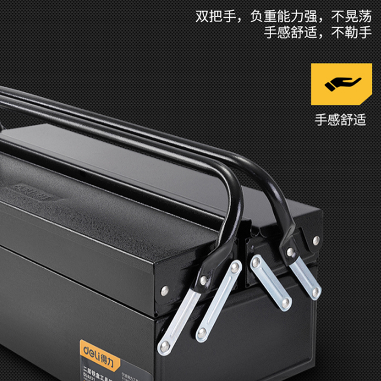 得力(deli) 加厚型金屬工具箱雙層翻蓋設(shè)計(jì),充分利用空間。