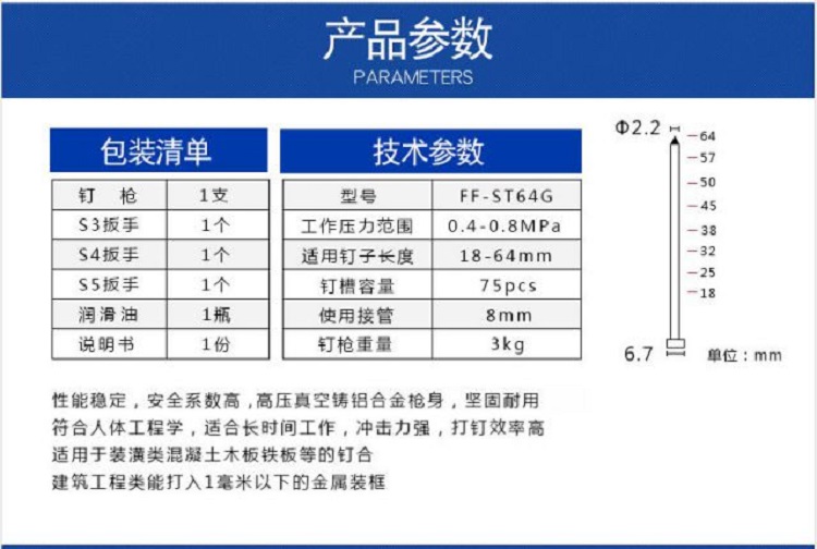 東成FFST64G氣動(dòng)鋼釘槍東成工具基本參數(shù)